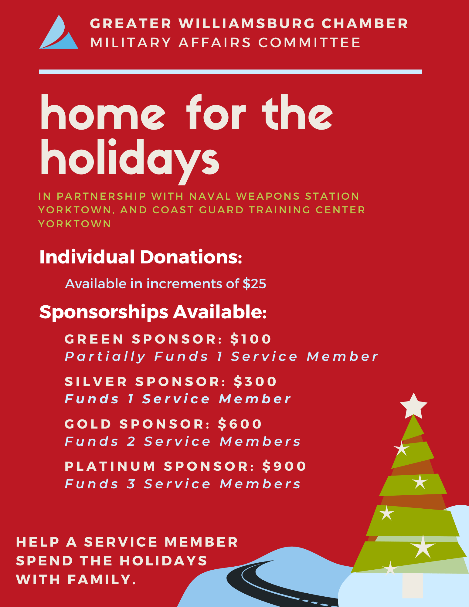 The Greater Williamsburg Chamber of Commerce's Military Affairs Committee is proud to present Home for the Holidays. In partnership with the Naval Weapons Station Yorktown, Marine Corps Security Force Regiment, and Coast Guard Training Center Yorktown.