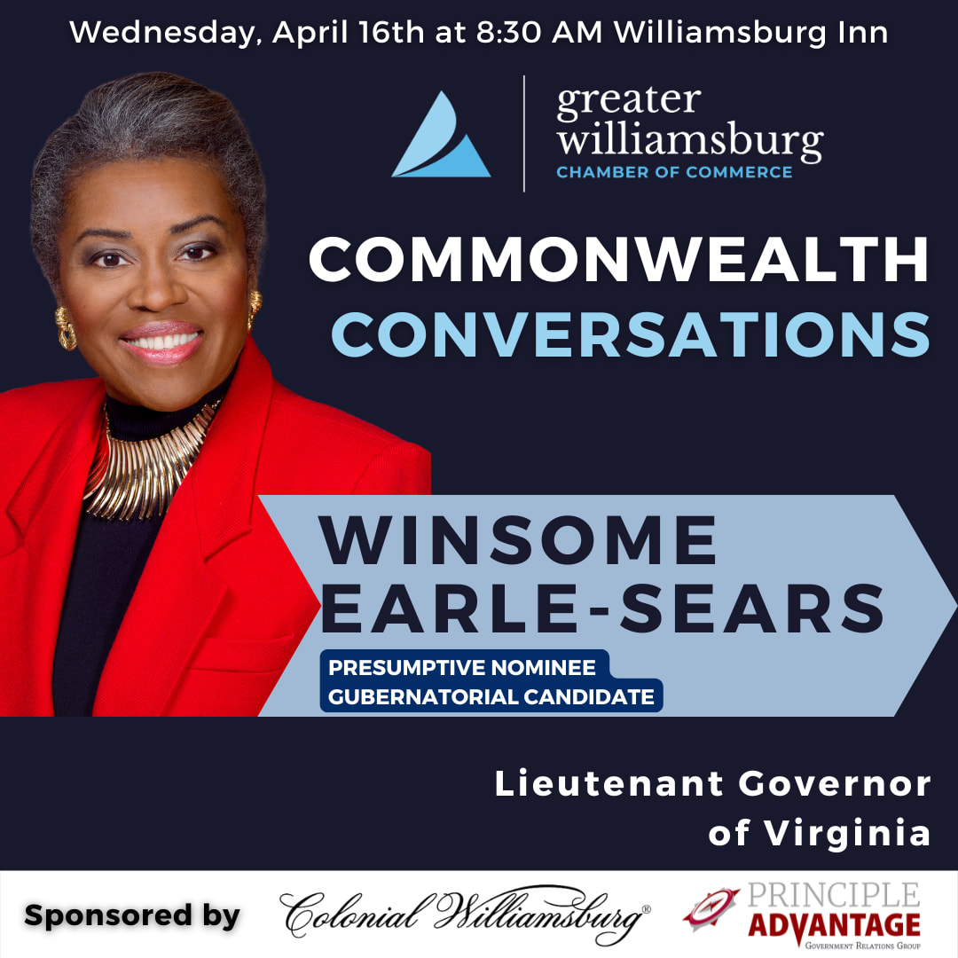 The Greater Williamsburg Chamber of Commerce is happy to announce that Commonwealth Conversations with Lt. Governor Winsome Earle-Sears has sold out. We look forward to seeing everyone at the event. We also look forward to seeing everyone at our upcoming Post Session Legislative Forum.