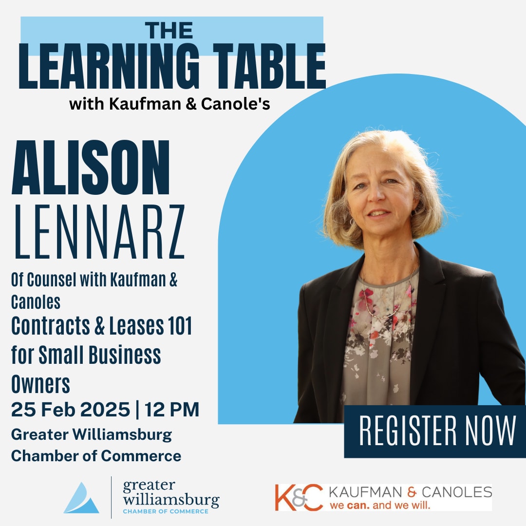 Join us for the second session of this 3-part series, starting February 25th, with the topic Contracts & Leasing 101 for Small Business Owners, presented by Alison Lennarz, Of Counsel with Kaufman & Canoles.