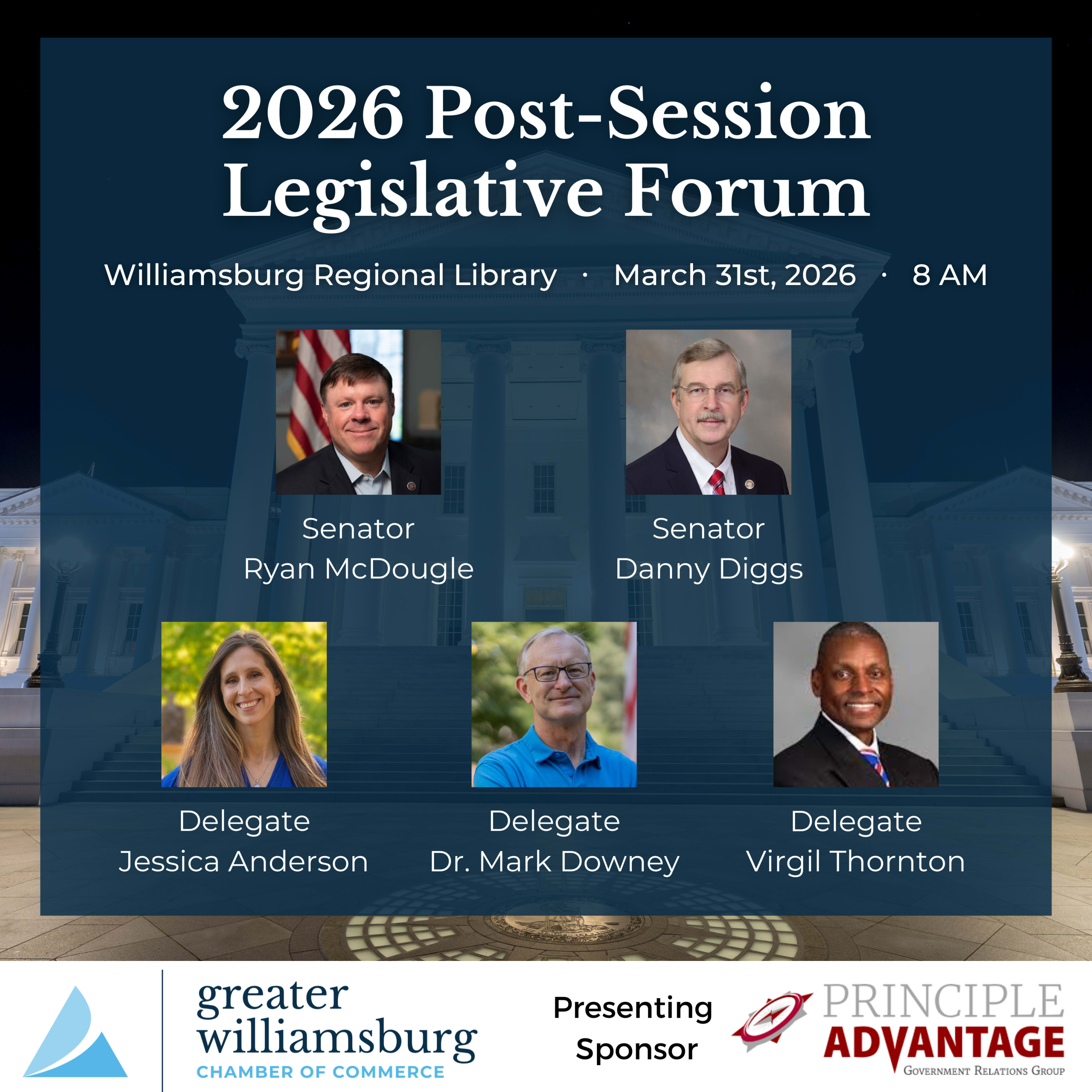 Join the Greater Williamsburg Chamber of Commerce (GWCC) for the 2026 Post-Session Legislative Forum. This event serves as a critical recap of the 2026 Virginia General Assembly Session, providing our community with a direct follow-up on the legislative actions, bills, and accomplishments that impact our region.