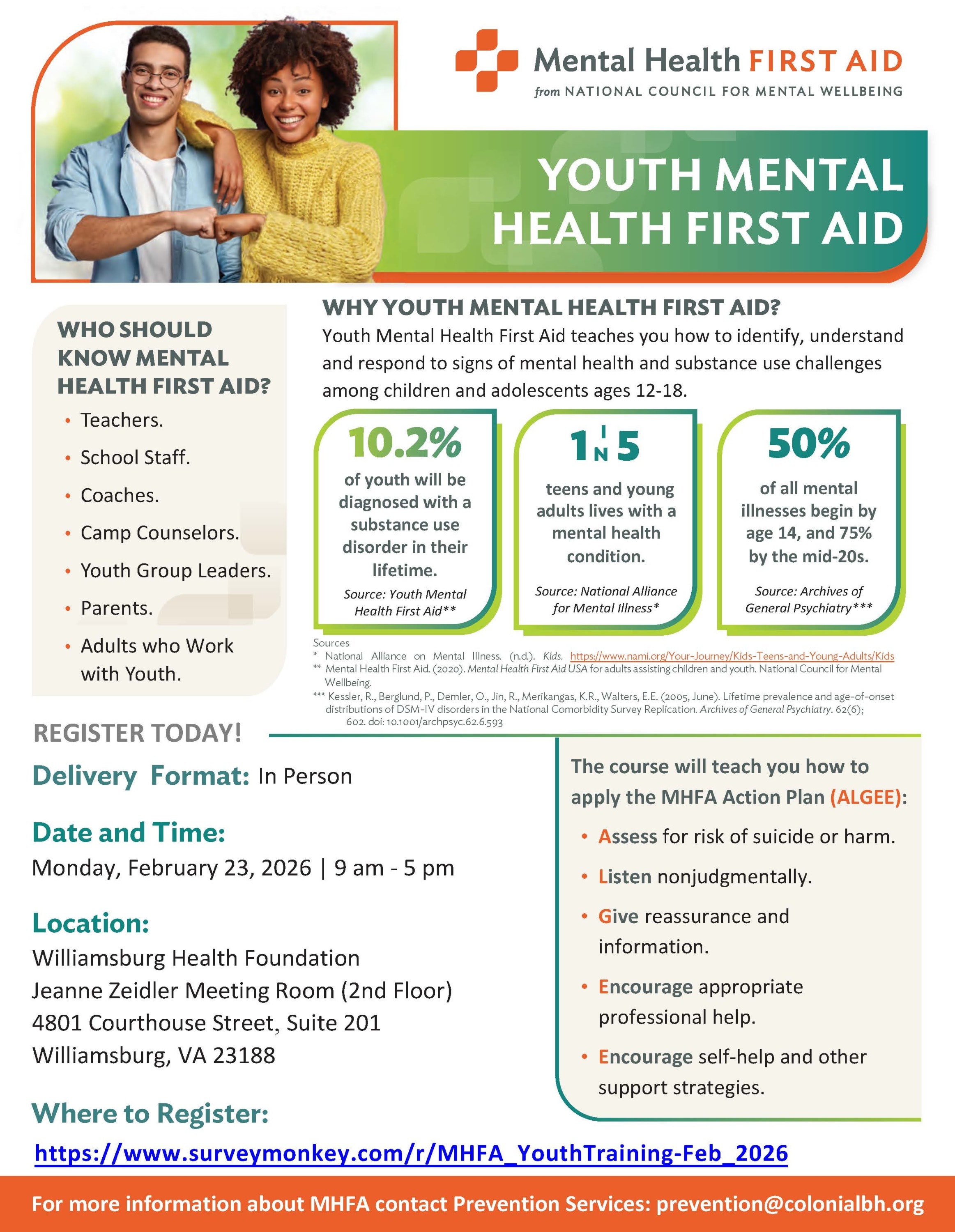 Colonial Behavioral Health - Prevention Services is proud to offer a FREE Mental Health First Aid – Youth training on Monday, February 23 from 9 am – 5pm, lunch is provided. Registration is limited to 15 individuals. To register go to: https://www.surveymonkey.com/r/MHFA_YouthTraining-Feb_2026 Please share with your staff, colleagues, friends, and family members!