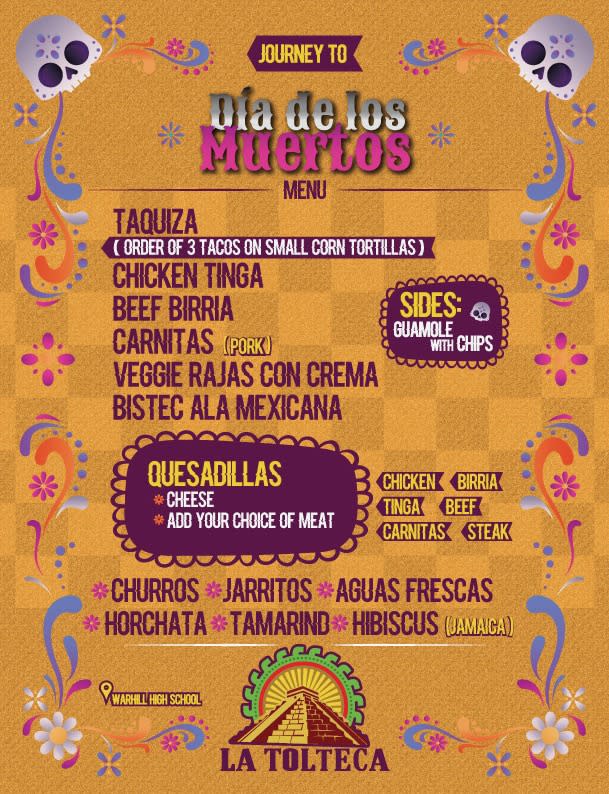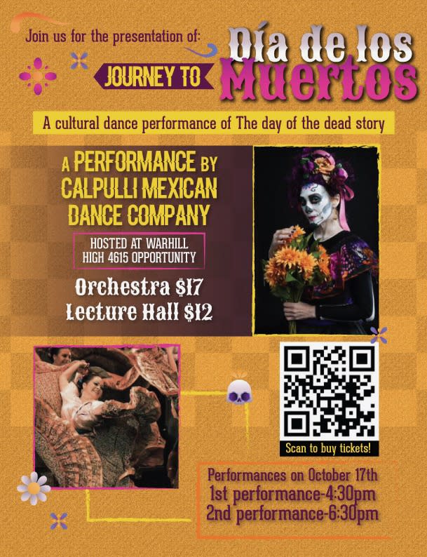 The Warhill High School World Languages department, Spanish Honor Society, Warhill Athletic department, and Lions Roar Theater Company arebringing a professional dance company called “Calpulli” to present an educational show that will explain what the Aztec celebration of Día de Muertos is as a prominent cultural celebration in Mexican culture. Students, parents, and community members are invited to attend the show on October 17th (4:30 and 6:30 shows). This show will engage the audience in a cultural journey through exploration of the traditions, songs, dances, and language that traces its earliest roots to the Aztec people in what is now central Mexico. “Día de Muertos”: The Day of the Dead! holiday is dedicated to honoring family members and loved ones who have passed on. The celebration lasts from November 1st through the 2nd. Warhill High School is proud to bring this experience to the community. Tickets can be bought on: WARHILL (booktix.com) Here is a teaser of the show which is authorized to be shared with anyone and in any place to get an idea of what the show will be about. https://youtu.be/PhEE6qAnMdc?si=H1FqI6OUut4EvuhtImages