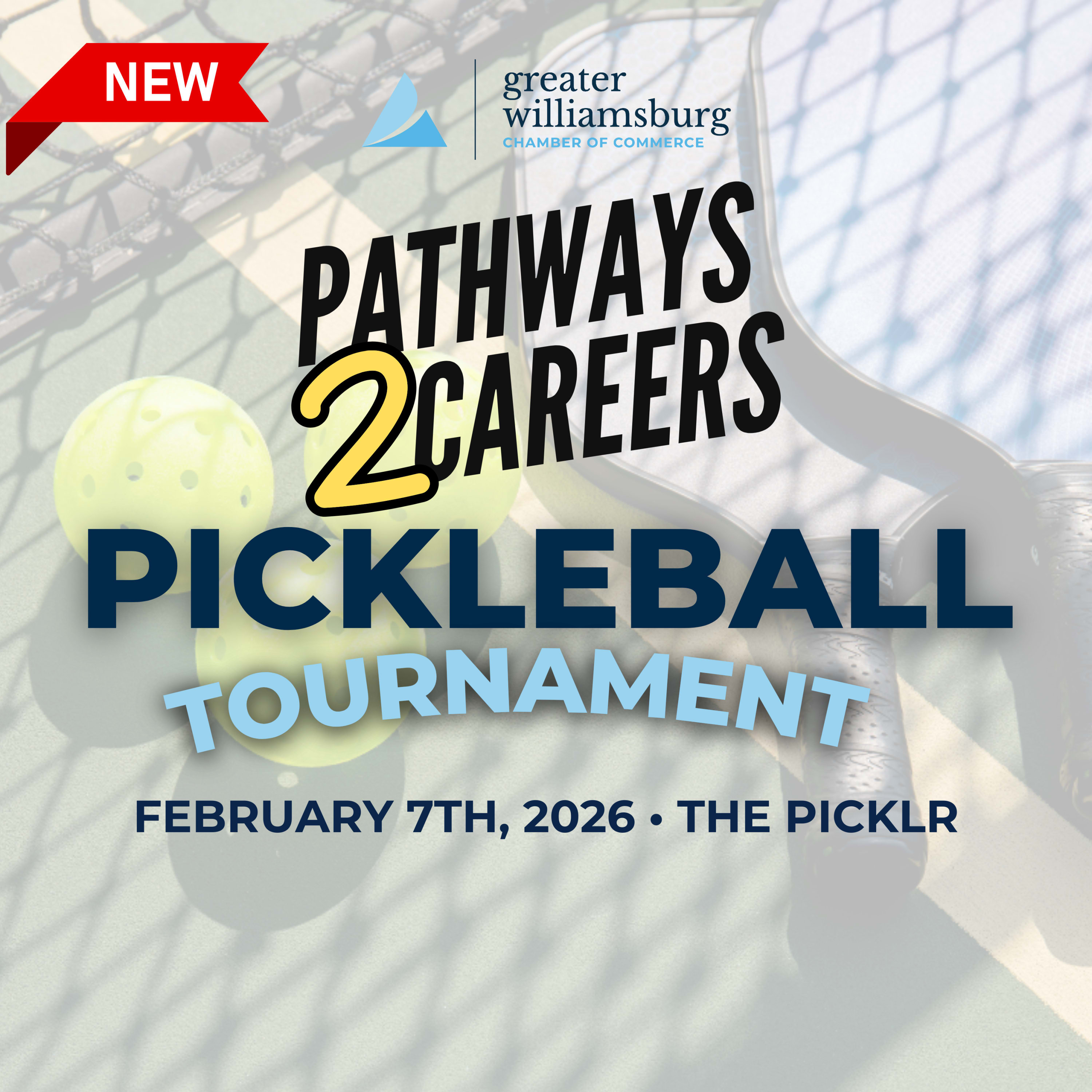 Get ready to rally for a remarkable cause! The Greater Williamsburg Chamber of Commerce invites you to participate in our inaugural Pickleball Tournament for Education—a day of friendly competition and powerful community support. Proceeds from this brand-new tournament will fuel the Pathways2Careers program and scholarships, helping local high school students pursue their college or trade school dreams.