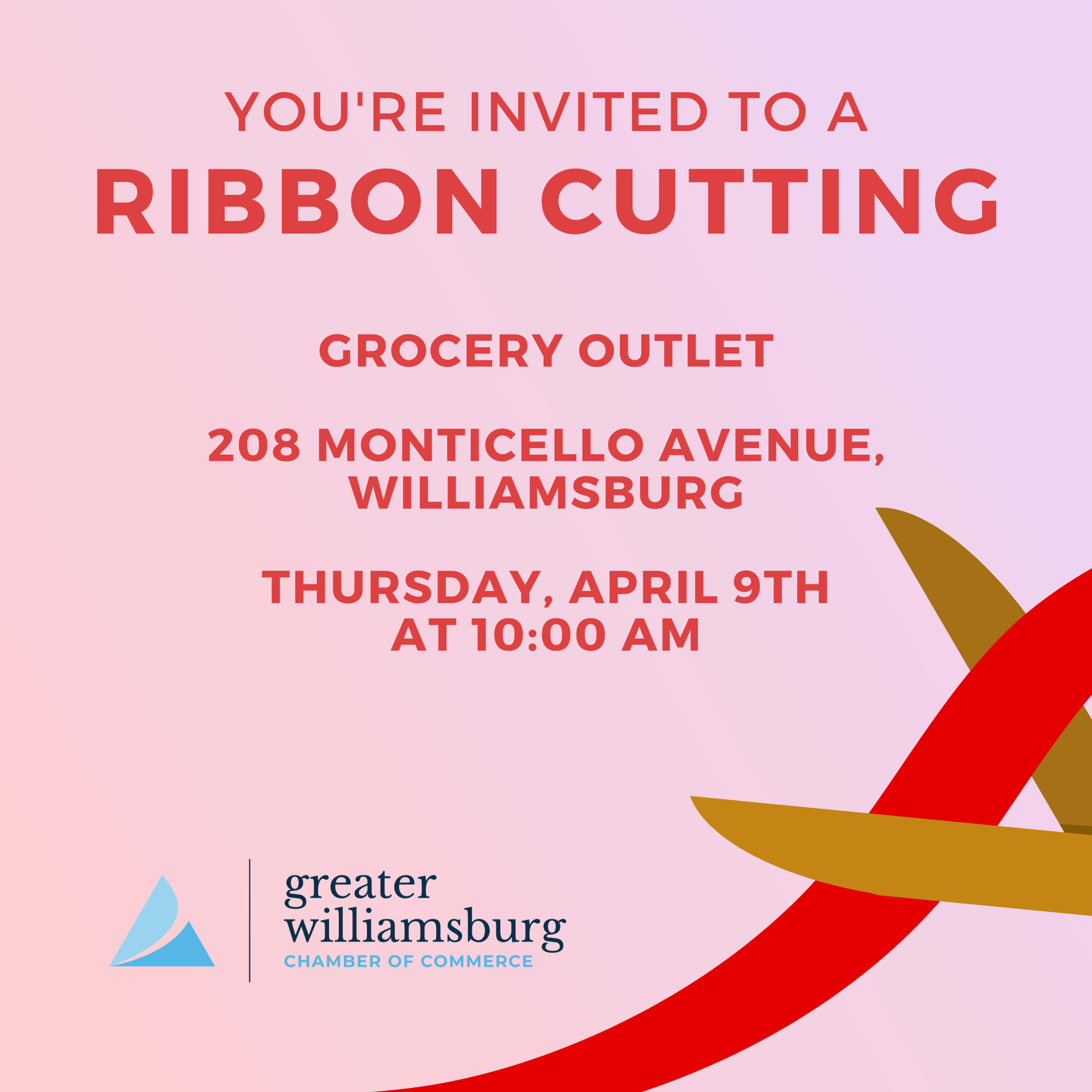 Join the Greater Williamsburg Chamber of Commerce for a Ribbon Cutting at Grocery Outlet to celebrate its grand opening with on Thursday, April 9, 2026, at 10:00 AM. The address is 208 Monticello Avenue, Williamsburg, VA 23185.