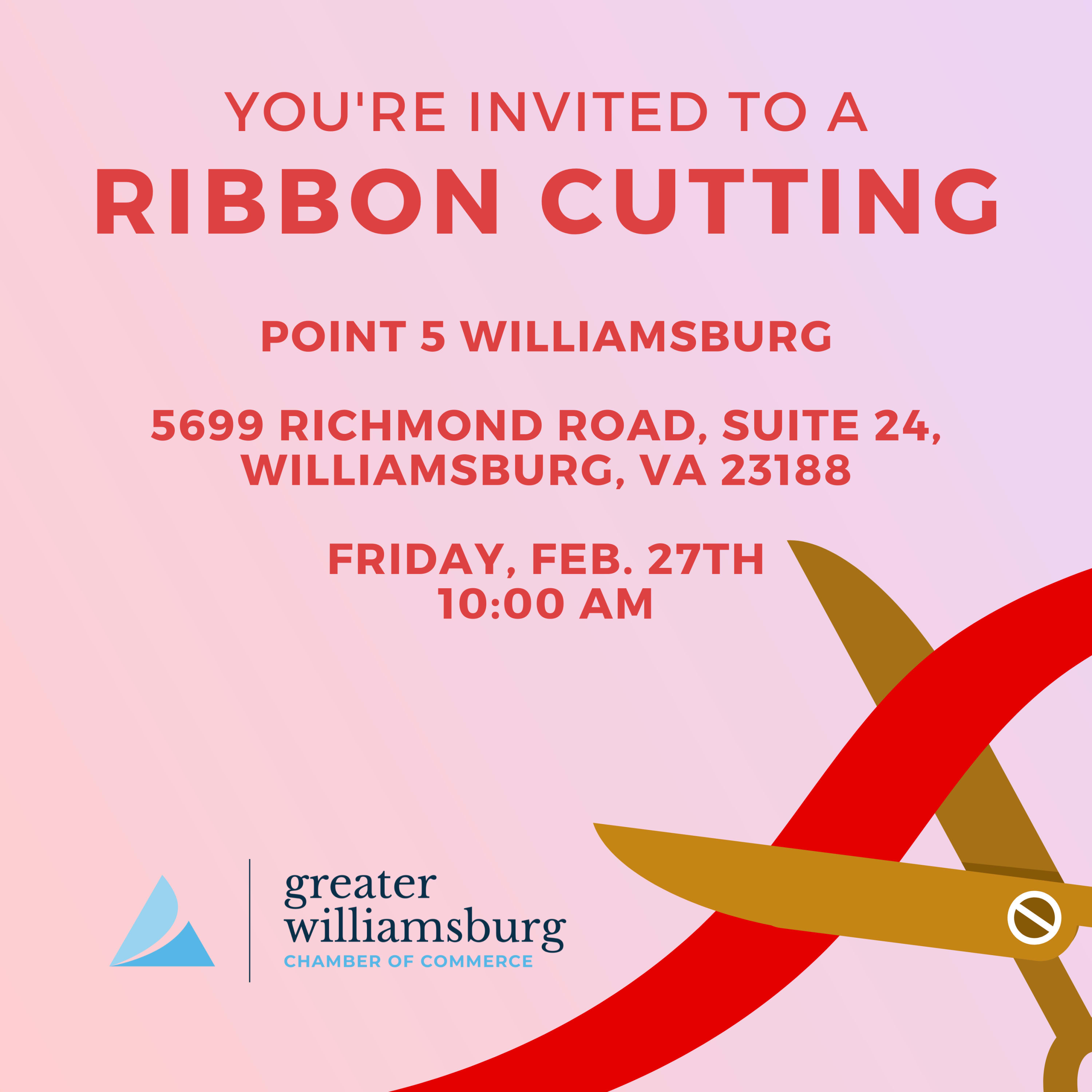 Join the Greater Williamsburg Chamber of Commerce for a Ribbon Cutting to celebrate the opening of Point 5 Williamsburg. The ribbon will be cut on Friday, February 27th @ 10:00 AM at 5699 Richmond Road, Suite 24, Williamsburg, VA 23188.
